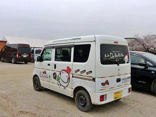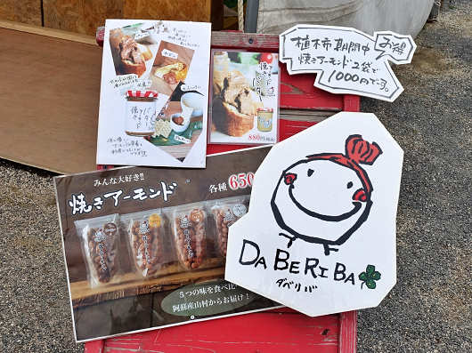 しばらく公園内を歩いていると、楽しそうな絵が描かれた熊本ナンバーの車が停まっていました。この車は熊本県産山村にある「焼きアーモンドカフェ ダベリバ」の車で、一昨年の「おおいた人とみどりふれあいいち」の時にはここに出店していましたが、昨年は出店していなかったので今年も来ないだろうなと思っていたんですよね。
