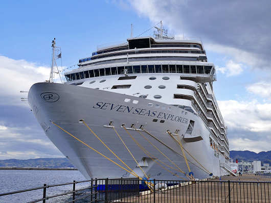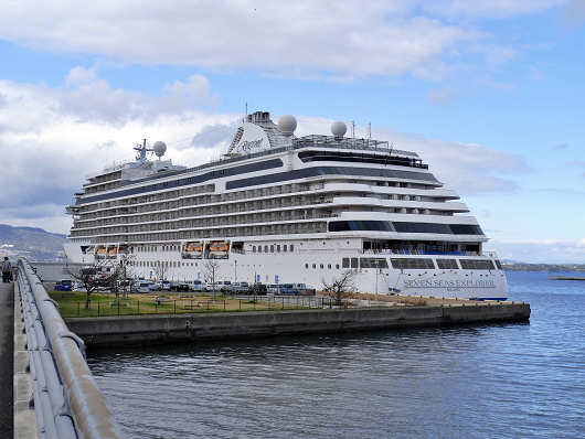 船首から眺めた「セブン シーズ エクスプローラ」です。このクルーズ船は総トン数で「ダイヤモンド プリンセス」の半分ほどの大きさですが、コロナ禍以降入港の途絶えていた外国船籍のクルーズ船が3年4ヵ月ぶりに入港するのは嬉しいことですね。