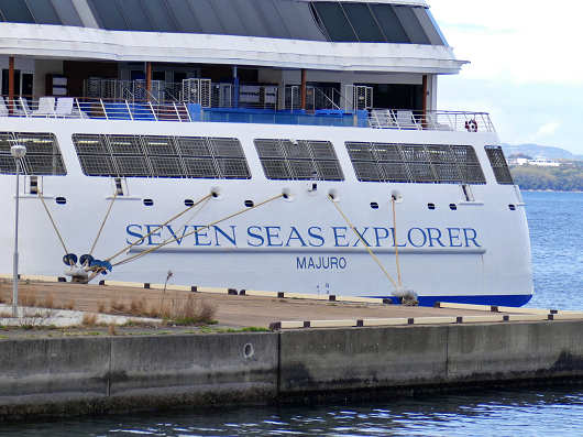 船尾付近まで行ってみると船名が見えましたが、このクルーズ船は「セブン シーズ エクスプローラ」と書かれていました。この船は初めて見るクルーズ船ですが、船名を直訳すると「七つの海の探検(者)」って意味になるんでしょうか? 世界各地をクルージングする豪華客船らしい素敵な船名ですね。そして船名の下に書かれた「MAJURO」は、船籍のあるマーシャル諸島共和国の首都のマジュロを表しています。