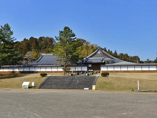 「城の駅 佐土原いろは館」の駐車場に車を停めて、道路の反対側を眺めると、広い駐車場とその奥には白壁に囲まれた武家屋敷のような建物が見えました。ここが「佐土原城址歴史資料館」です。