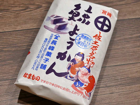 これが今回「城の駅 佐土原 いろは館」で買った鯨ようかんです。前回買ったものとは別の菓子店で作られたものですが、店内へ入った時にちょうど菓子店から配達されてきて、まだほんのりとホカホカ感がありました。消費期限を見ると本日中と書かれていたので、佐土原町周辺以外には流通しなくて、ここでしか買えないまさに幻の銘菓ですね。