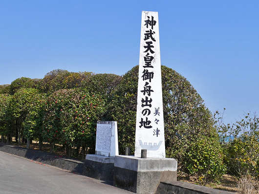 この日はりゅうママが一緒じゃなかったので、お家を出発したら途中休憩をほとんどせずに日向市まで走って、最初に休憩をしたのは日向市美々津です。ここを訪れる時にはいつも耳川河口に車を停めますが、この日は初めて河口とは町並みを挟んだ反対側にある観光駐車場に車を停めました。ここには「神武天皇御船出の地」と書かれた大きな石碑がありました。