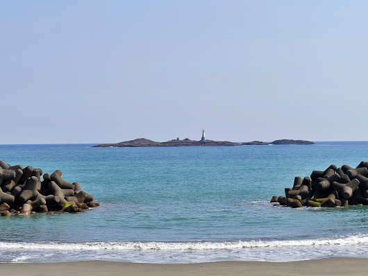 そして真正面の沖合を眺めると、岩礁の上に建つ灯台が見えました。画像では分かりませんが、灯台のすぐ横には祠らしきものもありました。この岩礁は「七ツバエ」といいますが、7つの岩礁があるんでしょうか?