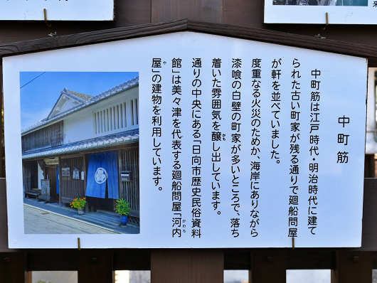 美々津は何度も訪れたことがあるところですが、古い町並みが残る通りをゆっくりと見物したことが一度も無いので、この日はお雛様を眺めながら町並み散策をしました。まず最初に歩いたのは廻船問屋が軒を連ねる「中町筋」です。