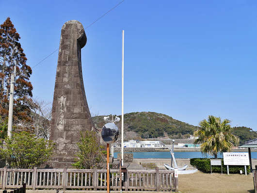 中町筋を抜けたところは耳川の河口で、この大きな塔は神武天皇がここから東征の船出をした伝説にちなんで「日本海軍発祥の地」と刻まれています。そしてこのすぐ左側には神武天皇が航海の安全を祈願したといわれる「立磐神社」があります。