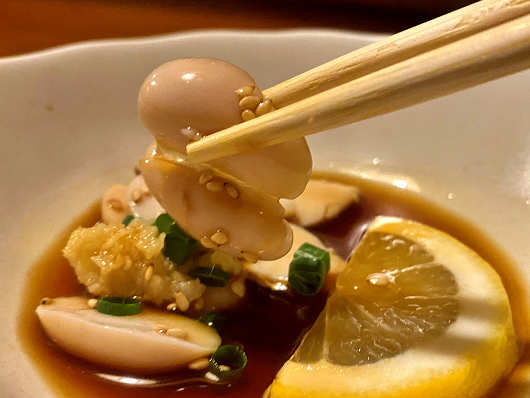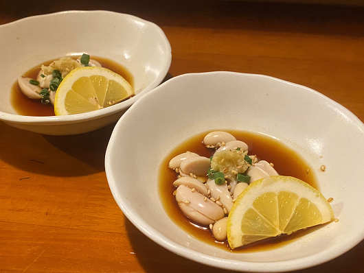 席に座ったらりゅうママはいつものように生ビールを、私は芋焼酎を注文して、まず最初に選んだ料理は、このお店のおススメ料理のひとつの鶏の白子ポン酢です。
