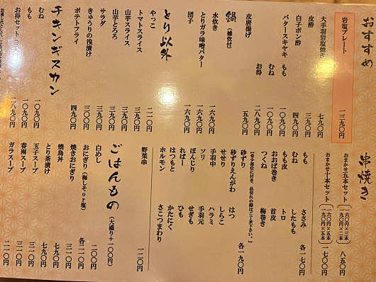 メニュー表です。このお店は鶏料理専門のお店ですが、料理はかなり豊富で初めて聞く名前の部位の串焼きや、ジンギスカンの鶏肉バージョン?のチキンギスカンなんて料理もありました。