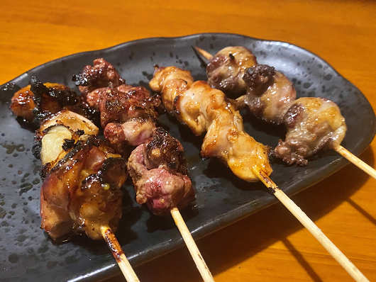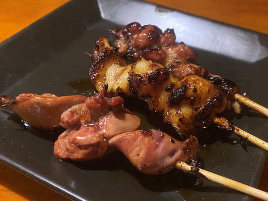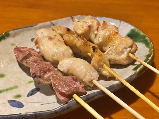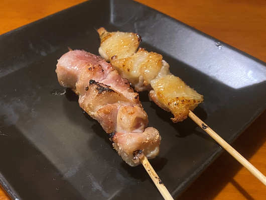 串焼きは種類が多くて普通の焼き鳥屋さんでは出てこないものも多かったので、おまかせの串盛りにはせずに1本ずつ選んで注文しました。最初に出てきた串焼きは左からハツ、白子、ぽんじり、トロです。