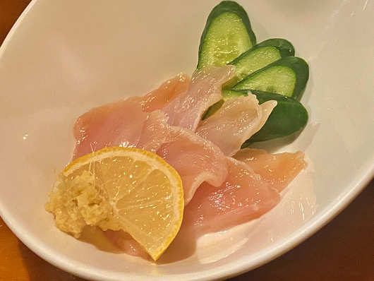 鶏刺しの酢〆です。酢はほとんど感じなくて、普通に新鮮でちょっと甘みのある刺身って感じでした。