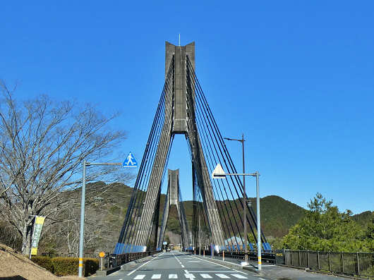 北川ダムから国道326号へ出て1㎞も走ると「唄げんか大橋」の大きな支柱が見えてきました。宮崎県方面へ遠出をした時には、帰り道でこの光景を見たらやっと大分県まで戻ったって感じでホッとするんですよね。