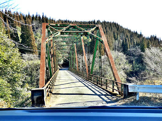 右折するとすぐに鋼鉄製の錆びて赤茶けた狭い橋が見えてきました。この橋は「田代橋」といいますが、これからこの橋を車で渡ります。