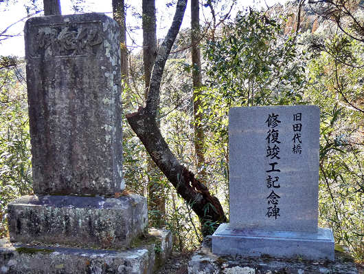 ここには二つの石碑があって、右側の新しい石碑には「旧田代橋 修復竣工記念碑」と刻まれていましたが、左側の苔むした石碑は文字が判読できませんでした。