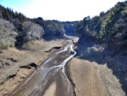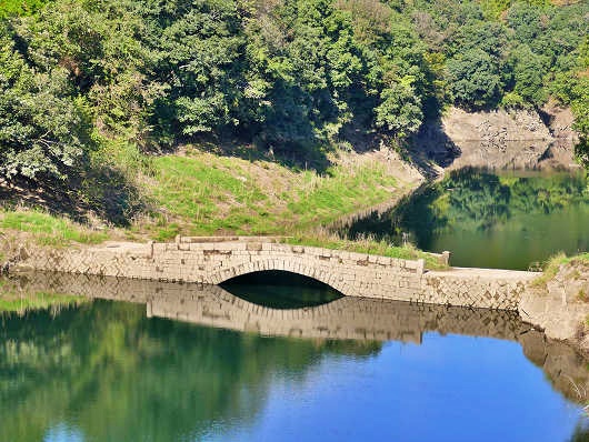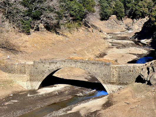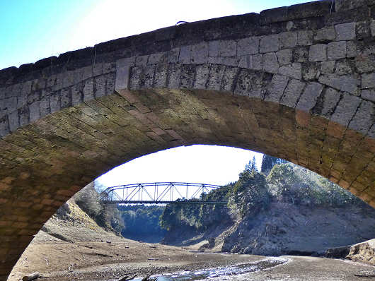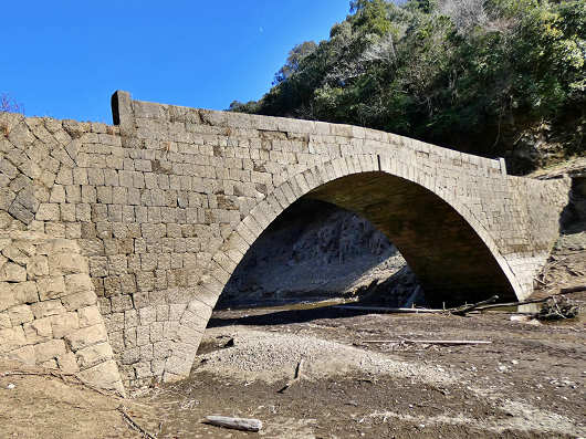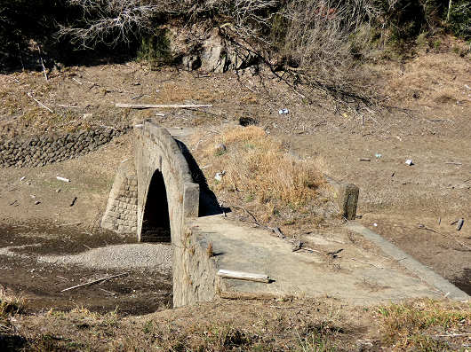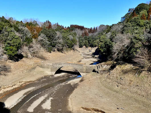 鋼鉄製の田代橋の上から干上がったダム湖を眺めたら、石橋の田代橋へと向かいました。この画像は田代橋のたもとから撮影しましたが、普段はこの辺りも水没していて近づくことができないんですよね。