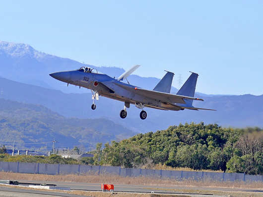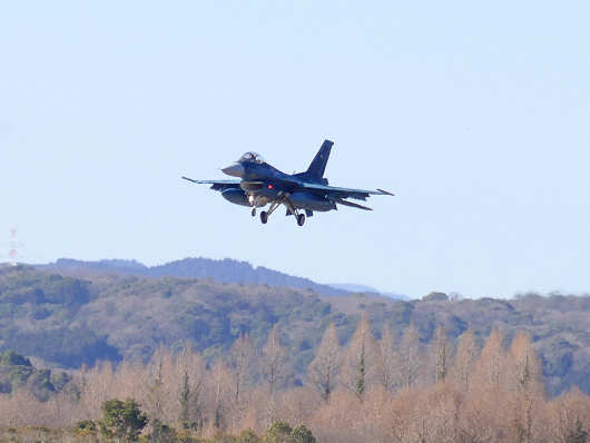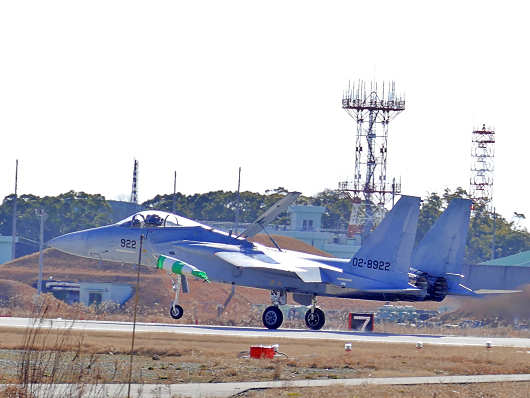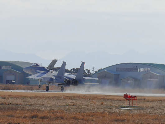 それでも寒いなかを車から降りて撮影スポットへ向かってしばらく待っていると、一機の戦闘機が着陸態勢で滑走路へとやって来ました。この戦闘機は築城基地には所属していないF-15イーグルです。