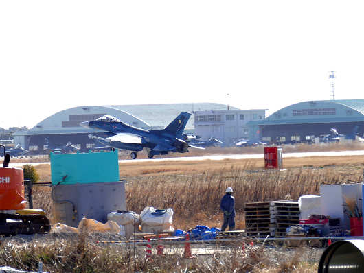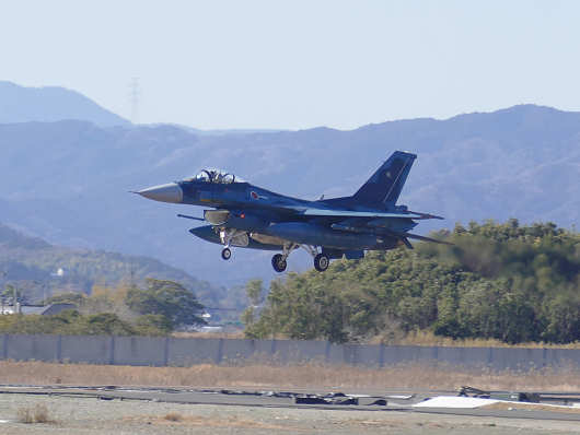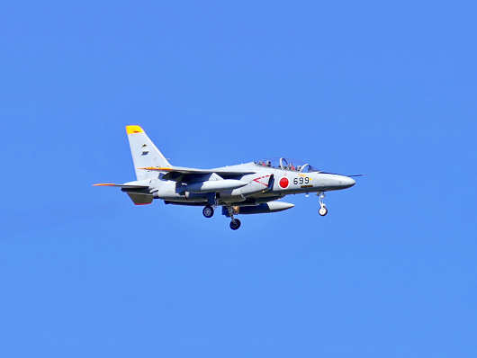 この日は前々日の春の陽気からうって変わり、とても寒い北風が吹いていたので、長時間に亘って滑走路脇で待機ができなかったので、時々車に戻って暖をとりましたが、その間に何機もの戦闘機が離陸していって撮影のチャンスを逃がしてしまい、最後に撮影できたのは、訓練空域の天候確認から戻って来たと思われるT-4練習機でした。