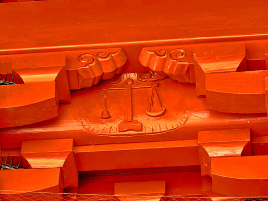 この三重塔には二層目の軒下の梁に十二星座の彫刻が施されていて、画像に写っている彫刻は「天秤座」ですね。