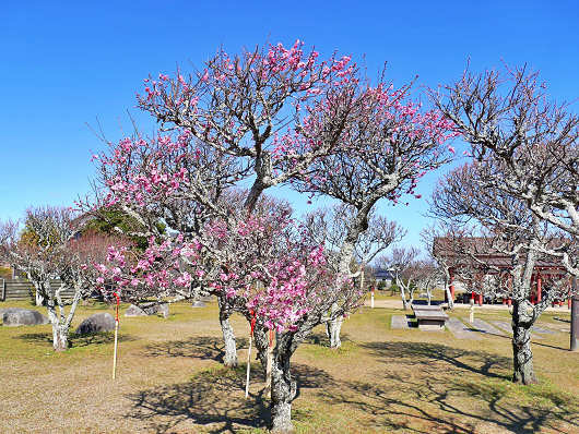 ここに植えられている梅の木は枝ぶりからいずれも古木のような感じでしたが、よく手入れをされていました。数年前にここを訪れた時には、ちょうど満開の時季でしたが、今年はちょっと開花が遅れているようで、チラホラと花が咲いている程度でした。