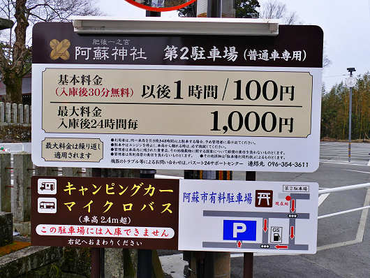 熊本市へは国道57号を通りましたが、途中で久しぶりに阿蘇神社へ寄ってみると、今まで無料だった駐車場が入庫後30分以上は有料になっていました。これまでは駐車時間を気にせずに阿蘇神社へ参拝した後は門前町のお店で食事や買い物もできたのに、これからは有料になるのは残念ですが、駐車料金は阿蘇神社の修復費用にでも充てるんでしょうか?