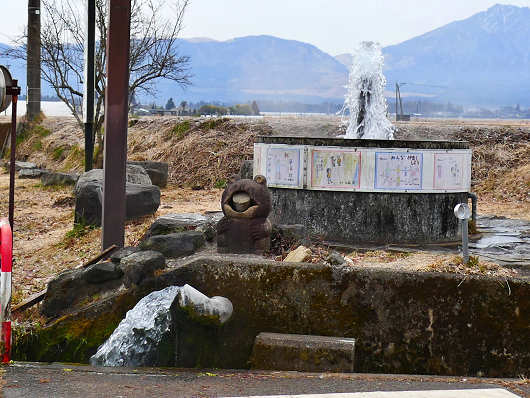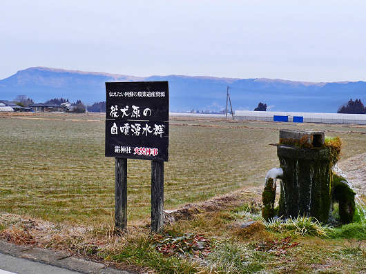 横から眺めると噴き出した水はそのまま側溝(水路)へと流れていました。この辺りはかなり広い田園地帯なので、この湧水が周辺の田畑を潤しているんでしょうね。阿蘇盆地にはいくつもの湧水がありますが、この様に噴き上がる湧水を見たのは初めてです。
