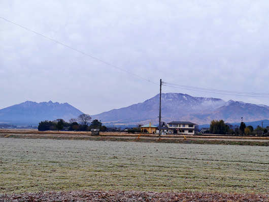 阿蘇神社からは田園が広がる中を通る県道110号を西に向かって走りました。障害物のほとんどない田んぼの向こうには阿蘇山が間近に見えて、雄大な阿蘇盆地らしい景色ですね。