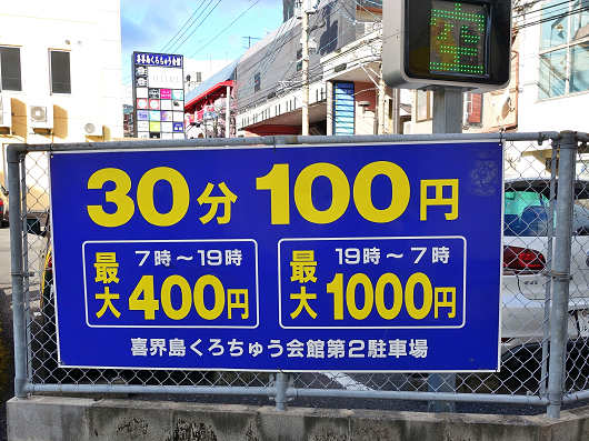 タンネルは狭い通りにあるバーなので駐車場はありませんが、目の前にはコインパーキングがあるので私たちはここに車を停めました。ここは「喜界島くろちゅう会館 第2駐車場」と変わった名前のコインパーキングですが、すぐ横には同じ名前のスナックなどが入ったビルがありました。