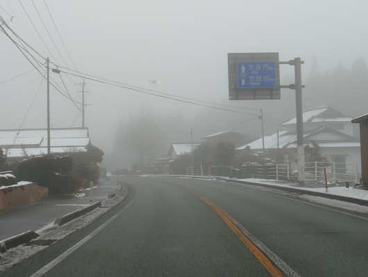 滝室坂を登り始めても雪は降りませんでしたが、徐々に霧が濃くなってきて、波野高原まで戻った頃には、まだ15時にもなっていないのに辺りは夕方のように暗くなってきました。