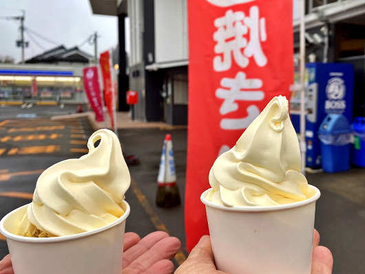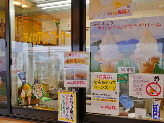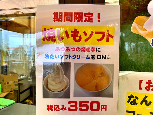 道の駅 すごう では夏には特産のトウモロコシを使ったコーンクリームソフトが有名ですが、この時季は熱々の焼き芋の上に冷たいソフトクリームを乗せた「焼いもソフト」がとても美味しいんですよね。
