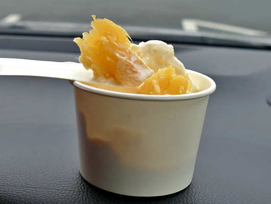 焼いもはカップの下に敷き詰められていて、その上にソフトクリームが乗っているので、ソフトクリームを食べ終える頃になると焼いもが出てきますが、ソフトクリームと焼いもはとても相性がいいので、いきなりぐちゃぐちゃとかき混ぜて食べてもとても美味しいんですよね。