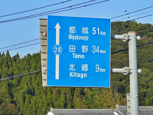しばらく県道28号を走っていると、田畑が広がる中にこの様な看板が見えてくるので、ここを右折して後ろに見えている高架を潜ります。この高架は前記事で紹介した日南東郷ICと日南北郷ICを結ぶ東九州道です。今はわずか9kmほどが開通しているだけですが、今年度中には清武南ICと繋がって、大分県を経由して北九州までの313kmが結ばれることになるそうです。開通すれば日南市がぐっと近くなりますね。