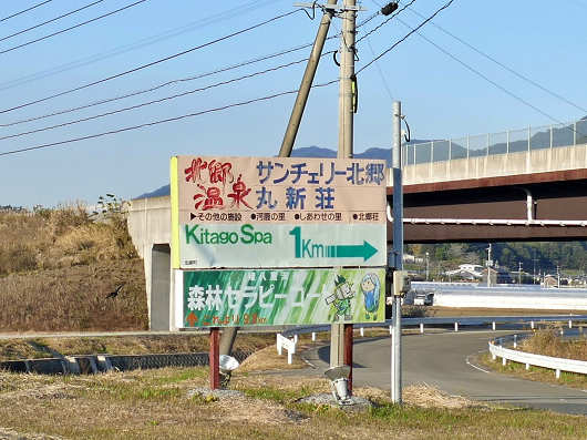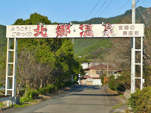 東九州道の高架を潜って先へ進むと、道路上にこの様な看板が見えてきます。北郷温泉は宮崎の奥座敷と呼ばれているようですね。