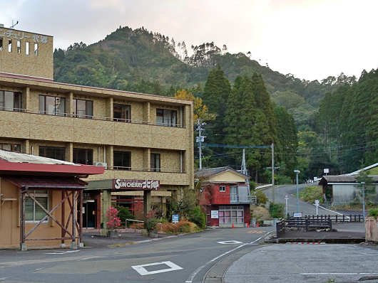 さらに先へ進むと大きな建物が見てきます。この建物は「サンチェリー北郷」という宿泊施設ですが、建築上の問題で閉館となっている施設で、今夜のお宿へはこの前を通り過ぎて坂道を登る手前を左折します。