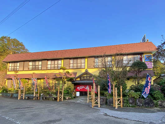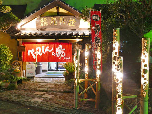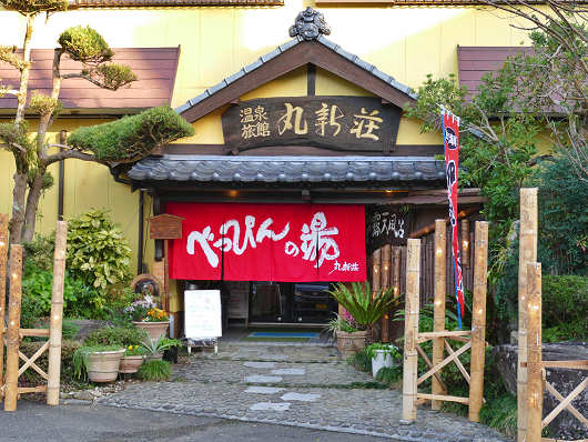 左折したらすぐに広い駐車場とお宿が見えてきます。ここが今夜のお宿の「べっぴんの湯 丸新荘」です。