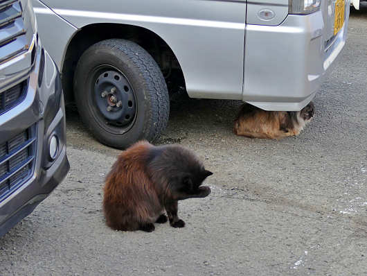 駐車場に車を停めたらたくさんのニャンコが寄ってきて、動物好きの私たちにはほほえましい光景に見えましたが、動物が嫌いな人はちょっと気になるかもしれませんね。
