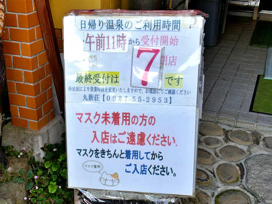駐車場に車を停めたらさっそくチェックインです。ここは立ち寄り湯にもなっているので、玄関前にはこの様な看板もありました。