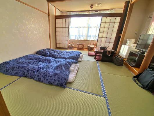 ここが私たちの宿泊する10畳の広縁付きの和室です。部屋に入った時に布団が敷かれていたのはちょっと残念でしたが、部屋はリニューアルされていて清潔感もあったので、口コミに書かれていたような悪い印象は全くありませんでした。口コミには冷蔵庫が無いとも書かれていましたが、テレビの横には冷蔵庫もありました。