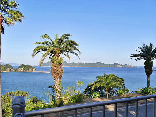物産館の前から見えるのはこの様な景色です。国道448号はこの下を走っていて、その向こうには日向灘から果てしなく続く太平洋が広がっていて、手前に見える島々の周囲は日南海中公園になっていて、水中観光船で群生している珊瑚や熱帯魚の観賞もできるそうです。