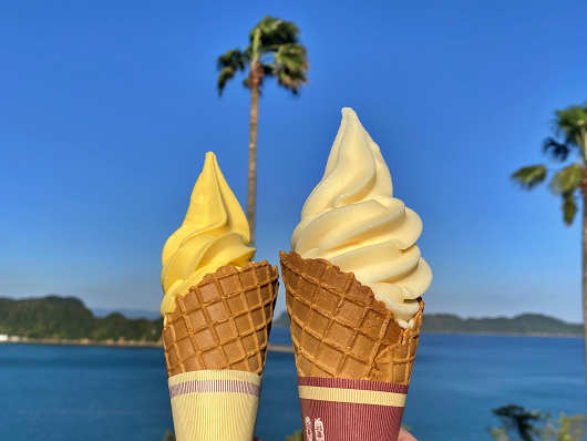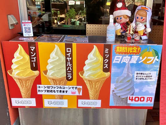 ここで買ったのは左がりゅうママの注文した期間限定の「日向夏ソフト」で、右は私の注文した道の駅イチオシの「マンゴーソフト」です。ソフトクリームを食べる頃には道の駅全体が山の陰になり始めてちょっと肌寒い感じでしたが、これで禁断症状?も収まったので、安心してお宿に向かうことができそうです(笑)