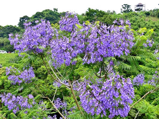 この画像は数年前のジャカランダ祭りの時に同じ場所から撮影した画像です。右上には展望台も写っていますが、この時はちょうどジャカランダが満開で、道の駅の駐車場も車を停められないほどの大賑わいでした。