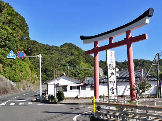 国道220号を左折すると真っ直ぐに進む道と、鳥居を潜って右に曲がる狭い道が見えてきます。この鳥居は鵜戸神宮の一ノ鳥居で、どちらの道を進んでも鵜戸神宮の駐車場へ行けますが、直進した先にある駐車場は鵜戸神宮の本殿からはちょっと遠いので、右折して一ノ鳥居を車で潜って海岸沿いの道を進みます。