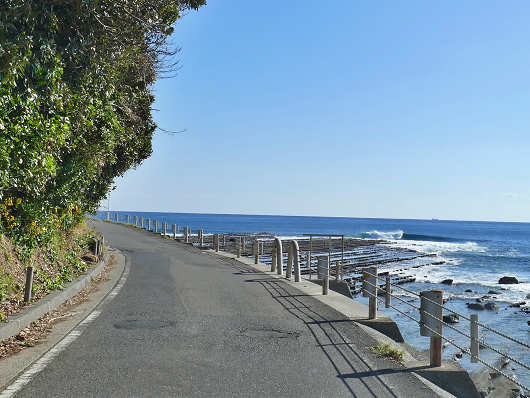鳥居を潜った先には住宅が立ち並んでいて、車同士がすれ違えないほどの狭い道ですが、狭い道を抜けると鬼の洗濯岩が見える海外沿いの景色のいい道になります。