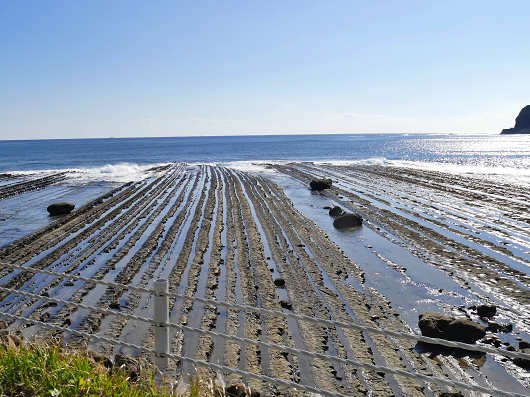 海岸沿いの道を進んで行くとこの様な景色が見えてきました。ここは「鵜戸千畳敷奇岩」と呼ばれていますが、ここには駐車場が無いので、車のスピードを落として景色を眺めたら先へと進みました。