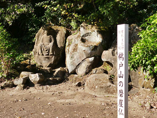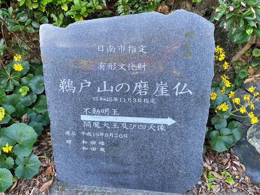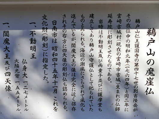 ここには鵜戸山の摩崖仏の説明板もありました。これによると摩崖仏が彫られたのは江戸時代の1760年代で、ここには閻魔大王と四天王が彫られているようです。