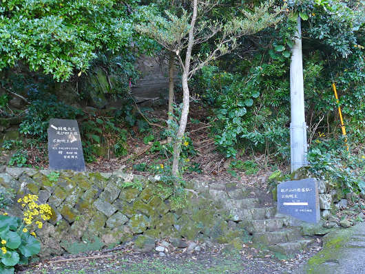 荒れた石段をしばらく登って行くと、ようやく「鵜戸山の摩崖仏」が見えてきました。でもこの目の前には鵜戸神宮の第二駐車場へと続く車道が通っていたので、最初から車でここへ来ていれば楽ができたのにとちょっと後悔です(笑)