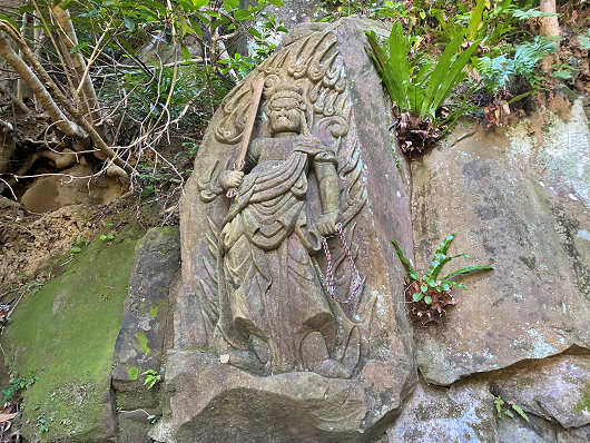 閻魔大王像の右側には四天王像といわれる4体の摩崖仏が彫られていましたが、こちらはちょっと風化が進んでいて、木々の影の影響もあって表情はよく分かりませんでした。