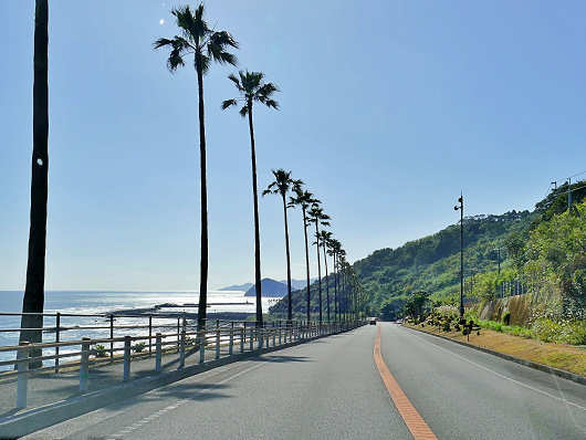 この辺りは日南海岸の中でも特に風光明媚なところで、海側にはヤシの木がズラリと植えられていて、青い空や青い海と相まって南国ムード満点のところで、快適なドライブを楽しめるところなんですよね。