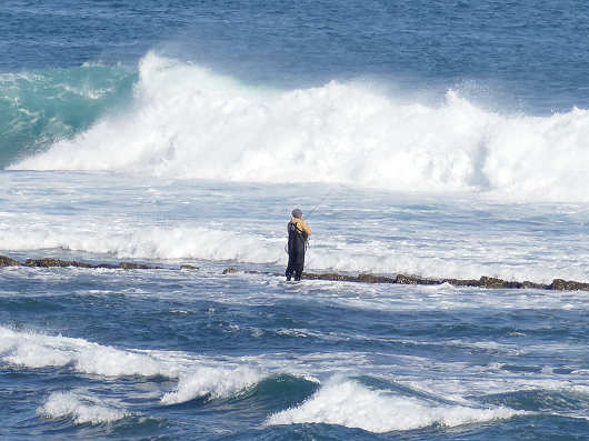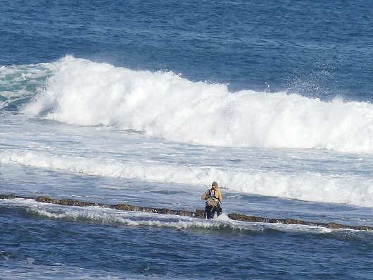 なんと釣り人が大波の打ち寄せるのも気にせずに竿を振っていました。