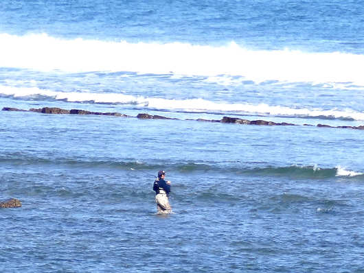 気になったのでさらに周囲を眺めてみると、膝上まで海水に浸かって沖へ向かって歩いて行く釣り人もいました。