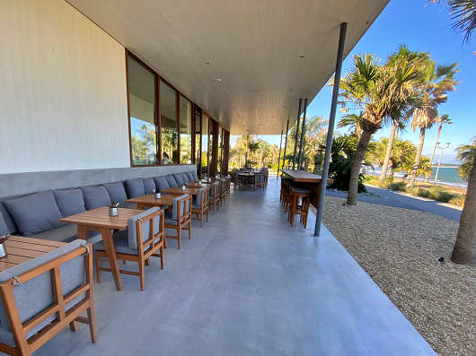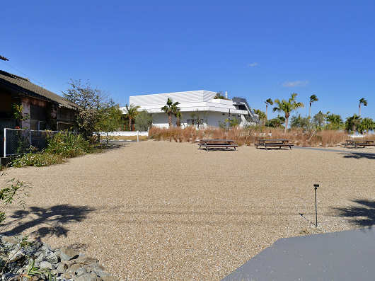 建物の周囲にはたくさんのイスやテーブルが置かれていて、テイクアウトしたハンバーガーなどを食べることもできるようでした。そして周囲にはBBQエリアもあるようだったので、暖かくなったら青島などを眺めながら食事をするのも楽しそうですね。