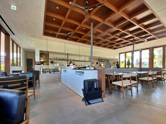 店内はこんな感じで、3面が大きなガラス張りになっている、とても明るくて広いスペースで、周囲にたくさん植えられたヤシの木などを通して青島海岸も見えました。