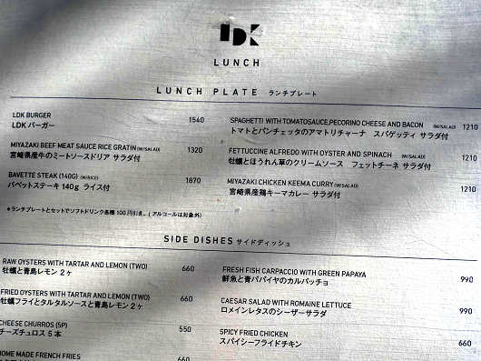 席に座ったらさっそく料理の注文です。メニュー表の文字が小さくてちょっと見難いですが、りゅうママはおすすめのLDKバーガーを、私は宮崎県産鶏キーマカレー、サラダ付きを注文しました。